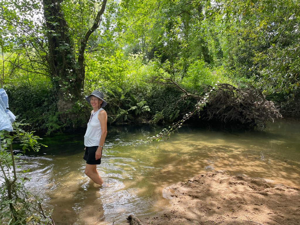 Toady I walked solo and did the whole 18 kms on my own which I loved. Despite the increased number of pilgrims (who have joined just to do the last 100k and get their certificate – which necessitates getting it signed min twice a day – which I keep forgetting) – it was quite easy to walk in peace and just listen to the sounds around me, especially the birds and insects, and the beautiful stream we followed. The countryside is sublimely beautiful in some places, especially by the streams, where the land is left to run riot and is covered in forget-me-nots and other gorgeous flowers. Up to 26 tho could have been more – but I could often walk in shade. Sat by a stream for ages and cooled my feet in the stream which helped. Looking extremely gorgeous in my new sensible hat and money belt hanging over my stomach.